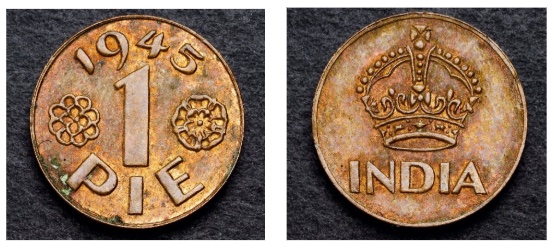 A moeda de 1 Pie, cunhada exclusivamente em 1945, durante o reinado de George VI, era composta em bronze, apresentando peso aproximado de 0,67 g e alinhamento do tipo medalha. No anverso, destaca-se a coroa imperial britânica ocupando a porção central, acompanhada da legenda “INDIA”. O reverso apresenta o ano de cunhagem e o valor facial e elementos ornamentais laterais, a flor de lótus e a rosa, símbolos recorrentes na iconografia monetária da região. A peça não possui serrilhado no bordo.