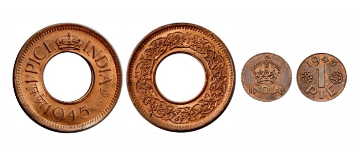 Na ocasião, celebrava-se o denominado “Pi-e”, considerado a menor moeda de ensaio do acervo do museu, cuja concepção revela uma solução técnica singular no contexto da cunhagem monetária. Segundo a publicação, em 1945, o governo da Índia solicitou à Casa da Moeda de Bombaim o desenvolvimento de uma moeda de valor ainda inferior à já existente peça perfurada de 1 Pice. Em resposta, os técnicos propuseram, em curto espaço de tempo, uma alternativa engenhosa: o reaproveitamento do disco metálico removido do núcleo da moeda de 1 Pice para a produção de uma nova unidade monetária, denominada “1 Pie”.