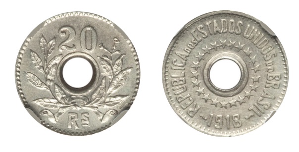 A análise dessas peças remete diretamente ao ensaio monetário brasileiro de 1918, no qual se projetava a introdução da primeira moeda furada destinada à circulação no país, iniciativa que permaneceu restrita ao campo experimental. Tal proposta inseria-se em um contexto de reorganização do meio circulante, sendo concebida como uma unidade de menor valor, destinada a substituir as emissões da série MCMI.